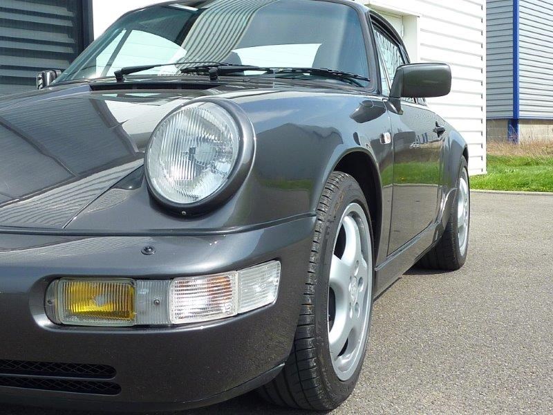 Bien que parisienne, cette 964 Carrera 2 n'a visiblement pas souffert des aléas de la circulation urbaine puisque ni sa carrosserie, ni ses boucliers ne portent la moindre trace de contact ou de frottement. La peinture gris foncé étant d'une brillance inhabituelle pour une voiture de cet age. Cet état exceptionnel, on le retrouve aussi sous le capot avant mais aussi sous le capot moteur. Mais c'est l'habitacle qui est le plus impressionnant puisqu'il ne présente pas la moindre trace d'usure pour ne pas dire la moindre trace d'usage. Le volant, le levier de vitesses, le caoutchouc des pédales et même le cuir des sièges semblant neufs. D'ailleurs, elle sent encore un peu le cuir neuf, une odeur qui fait chavirer les papilles de tout amateur de voiture de luxe ou de sport ..."